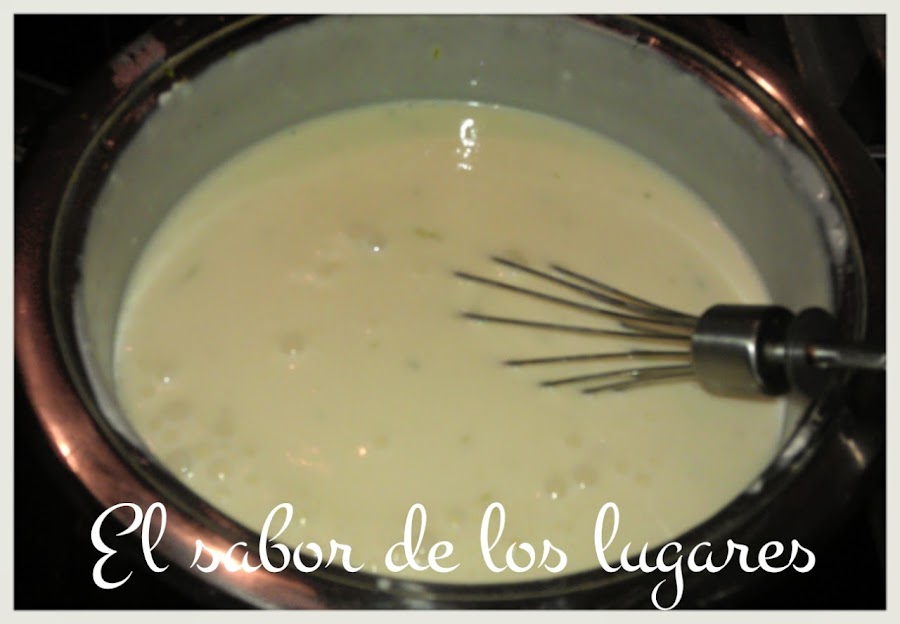 Pon un cazo al fuego con la nata (crema de leche), el queso, los 120 gr. de azúcar, las hojas de gelatina bien escurridas, la ralladura de 1 lima y el zumo de 2 limas. Mantén a fuego medio removiendo constantemente hasta que se mezclen bien todos los ingredientes (15 minutos aproximádamente), pero con cuidado de que no llegue a hervir.