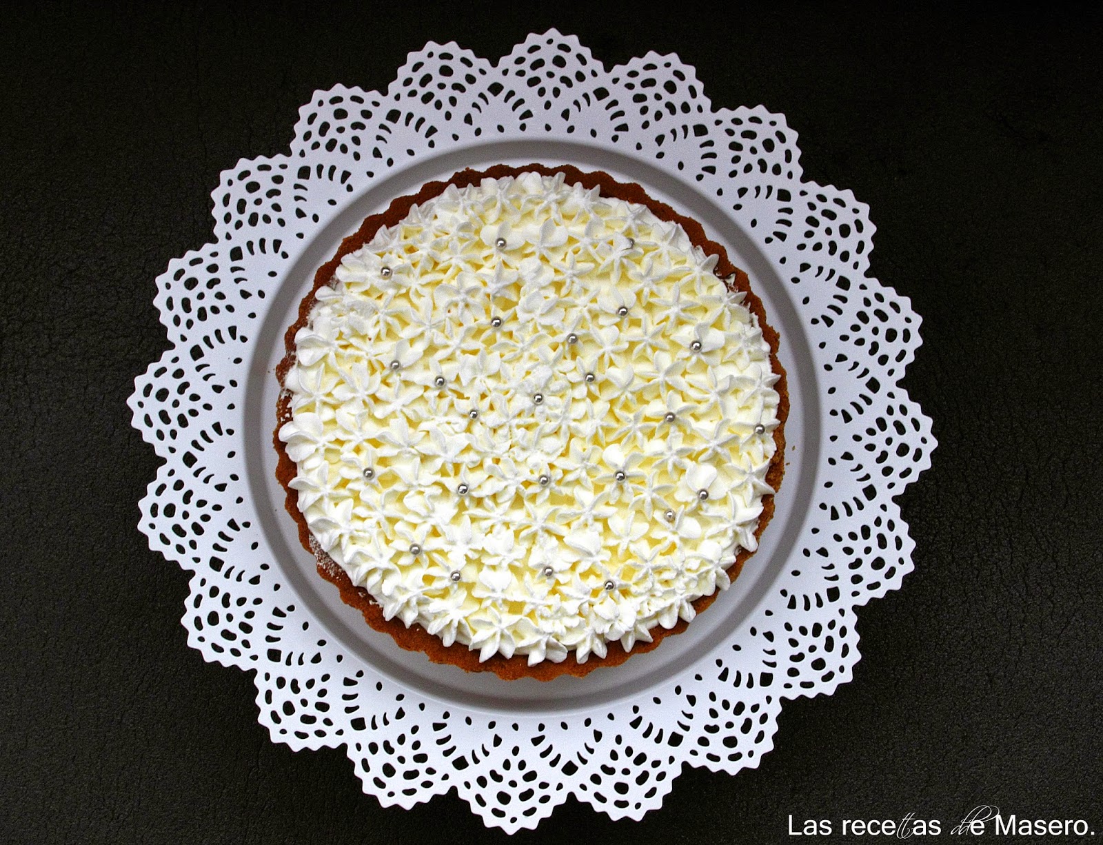 Cubrimos con nata (crema de leche) la base de la tarta con una espátula y decoramos al gusto con una bonita boquilla.