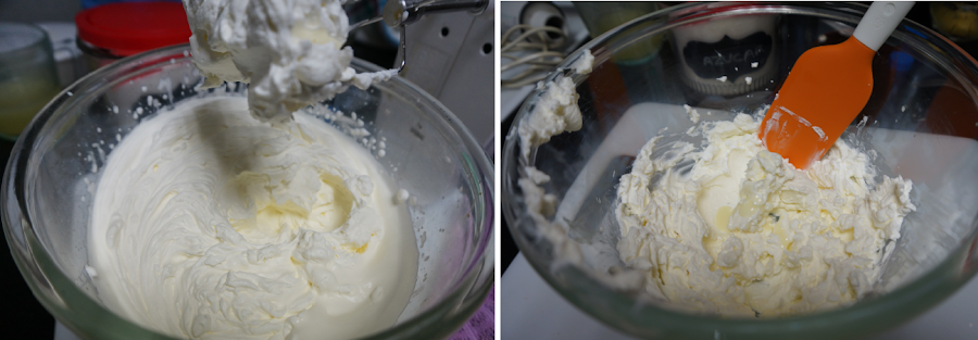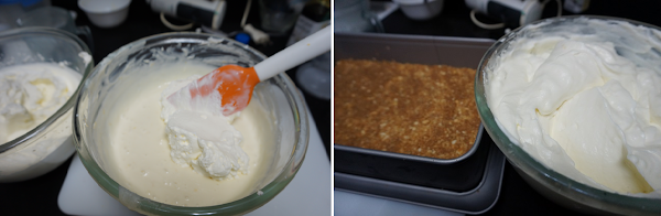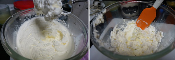 En un bol montamos la nata (crema de leche) junto con el azúcar, por otro lado batimos el queso crema.