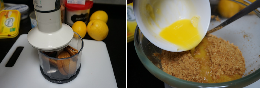 Lo primero trituramos las galletas, las pondremos en un bol junto con la mantequilla derretida. Mezclamos todo bien.
