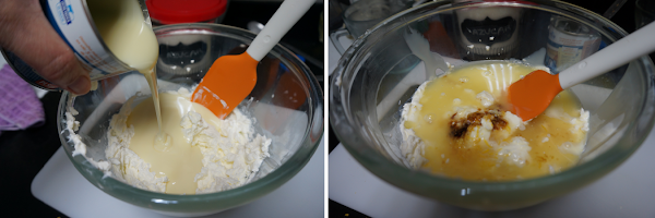 En el bol de queso crema, añadimos la leche condensada, la iremos mezclando poco a poco hasta que quede integrada, al zumo de limón, la ralladura de un limón y una cucharadita de esencia de vainilla.