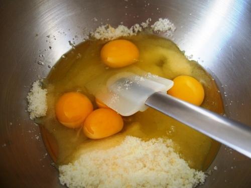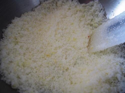 Incorporamos la harina cernida y la trabajamos suavemente con los dedos, hasta obtener una masa granulosa.