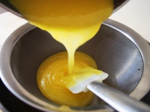 Retiramos del fuego y pasamos la preparación por un colador para así obtener una crema lo mas fina posible. Cuando la preparación este a 35°c incorporamos la mantequilla en cubos y también la gelatina (lo mas exprimida). Incorporar con la ayuda de una espátula y posteriormente con una minipimer para así emulsionar la preparación.