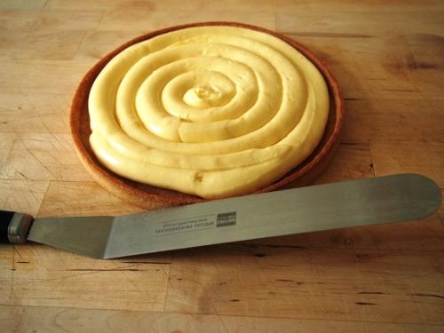 Con la ayuda de la espátula emparejaremos la crema en nuestra masa dulce. Refrigeramos.