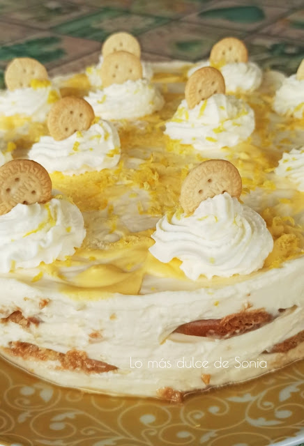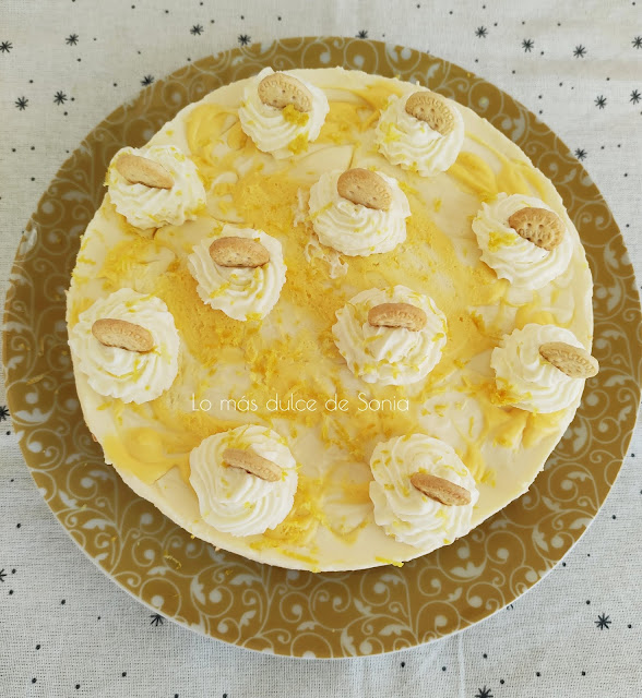 Al día siguiente, montáis un poco de nata (crema de leche), hacéis unos pequeños montoncitos y colocáis una mini galleta en cada uno. También puse ralladura de limón.
