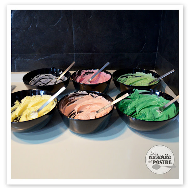 1. Una vez que tengas la crema básica, separa en seis boles un par de cucharadas de crema en cada uno. Esta crema la teñiremos más adelante para usarla con las boquillas rusas.