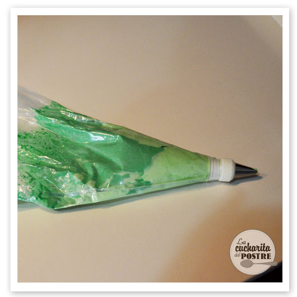 6. Después rellena una última manga con los dos tonos de verde, uno en cada mitad de la manga, usando una boquilla para hacer hojas. Las más habituales son la número 352 y la 69 de Wilton.