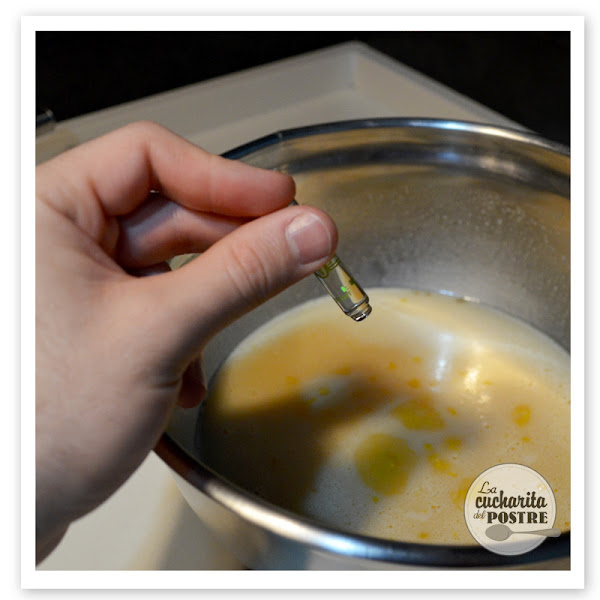 4. Ahora es el momento de aromatizar el bizcocho con unas gotitas de esencia de limón y la ralladura de un limón.