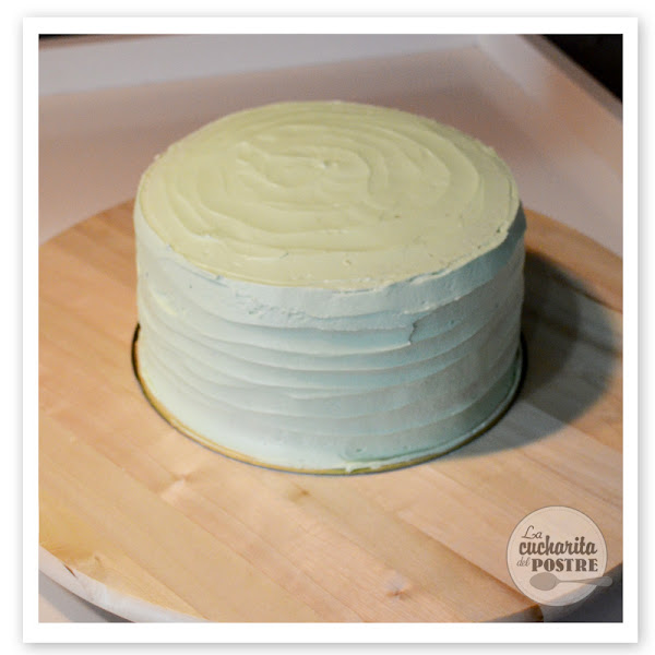 7. Cubre toda la tarta con el resto de la crema de menta, tanto por los laterales como por la parte superior. Puedes dejarla lisa o hacer algún dibujo con la espátula. Yo he optado por una espiral en la parte superior y unas franjas en los laterales. Guarda un poco de crema para usar con las boquillas rusas.