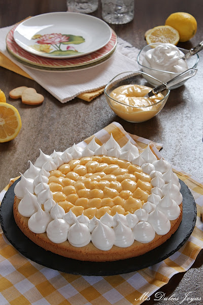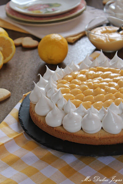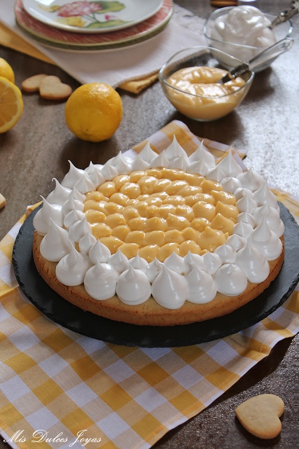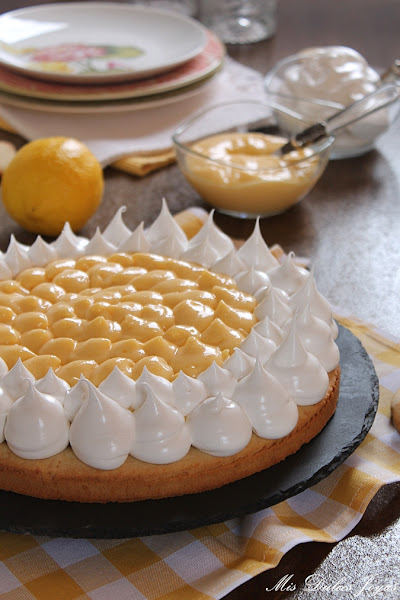 El otro día me apetecía hacer algo así, sobre todo por variar un poco en presentación. He preparado una base de sablée un poco mas gruesa y plana (sin bordes, me refiero que no está horneada como si fuera una tartaleta), la he cubierto de crema de limón o lemon curd clásico (y digo clásico porque la crema en esta ocasión está preparada con huevo, zumo de limón y mantequilla, sin leche condesada, ni maicena, tal y como se hace la clásica lemon curd) y la he cubierto de merengue francés, el cual en esta ocasión he espolvoreado con azúcar glasé en vez de tostarlo. Sólo deciros que nos ha encantado en casa. El azúcar glasé le aporta un toque crujiente muy especial a la tarta, quizá no se nota en las primearas horas de hacerla, pero si pasadas unas horas, es pura magia.