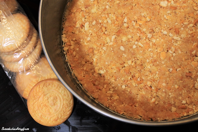Para la masa, trituraremos galletas y mezclaremos bien con mantequilla o margarina previamente derretida para crear una masa compacta. Añadiremos a nuestro molde de tartas y la dejaremos lo más homogénea y lisa posible.