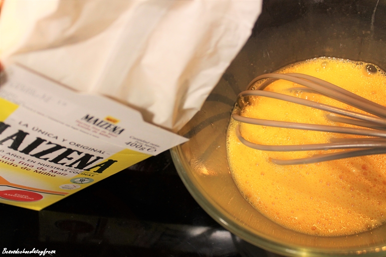 En un bol ponemos los 2 huevos y las yemas con unas cucharadas de leche condensada y batimos con las varillas. Añadimos unas cucharadas de maizena y una pizca de sal.