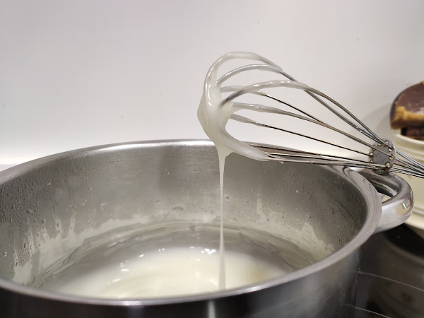 Ahora sí que podemos ir preparando el merengue. Yo suelo hacer merengue suizo, que es con el que mejor me defiendo, pero para ser fiel a la receta original me puse con el italiano. Da igual qué tipo de merengue hagáis, siempre es muy importante que el cuenco y el batidor que utilizemos estén bien limpios y libres de grasa, ya que esto hace que las claras no suban. Por si acaso a mi me gusta pasar un poco de papel de cocina empapado en zumo de limón o vinagre.