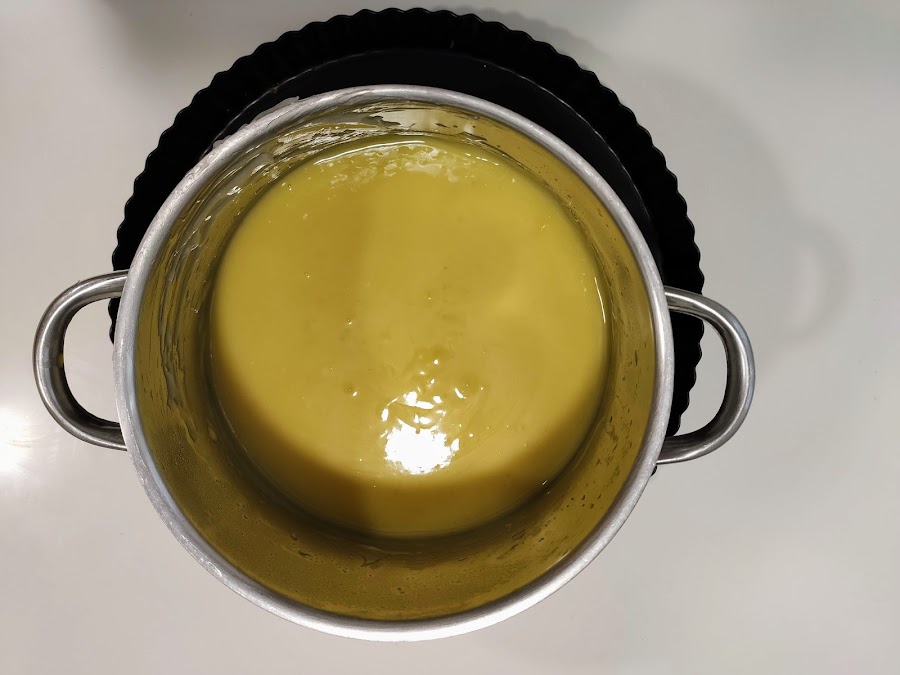 Añadimos el agua a la cazuela con la maicena y el azúcar y removemos con un batidor hasta que no queden grumos. Añadimos a fuego medio removiendo constantemente para que la mezcla no se pegue al fondo de la cazuela. Como pone en el blog, hay un momento que por arte de magia empiezan a aparecer bolitas, no os preocupéis y seguir batiendo, que poco a poco desaparecen. La mezcla debe estar al fuego un buen rato para que la maizena se cocine, si no, nuestra crema sabrá a harina. Podéis probar (con cuidado de no quemaros) para ver cuando está hecha
