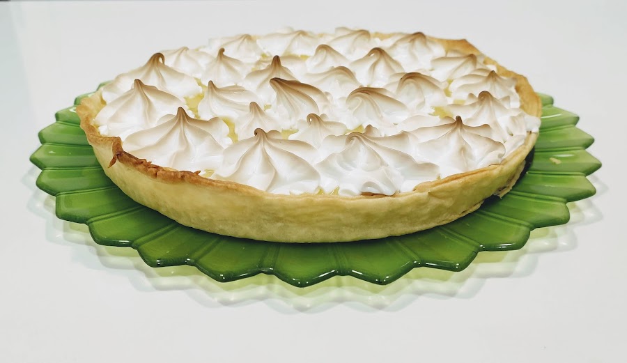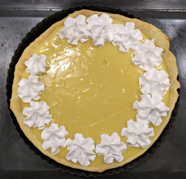 Ya tendremos la base semi horneada. Le añadimos la crema de limón y pasamos a decorarla con el merengue. Para esto lo ponemos en una manga pastelera con una boquilla rizada y ancha. Vamos haciendo pequeños montoncitos. Yo los hago en círculos desde fuera hacia dentro.