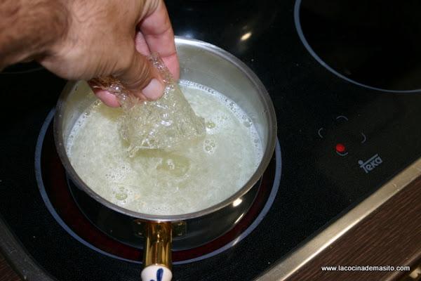 Cuando empiece a hervir, retiramos del fuego e incorporamos las hojas de gelatina, removemos bien y dejamos templar