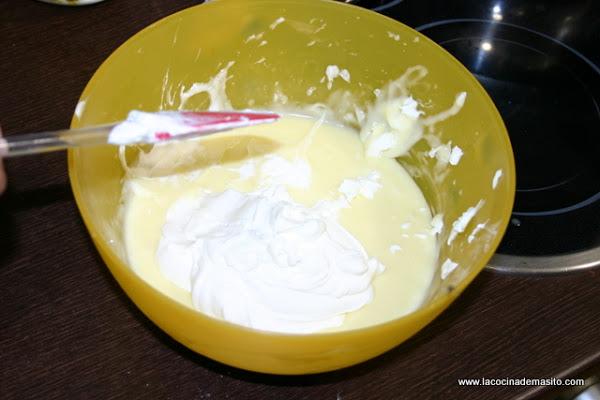 Montamos la nata (crema de leche) junto con la otra mitad del azucar y una vez montada la incorporamos a la mezcla del queso y con movimientos envolventes lo juntamos todo hasta que quede bien homogeneo