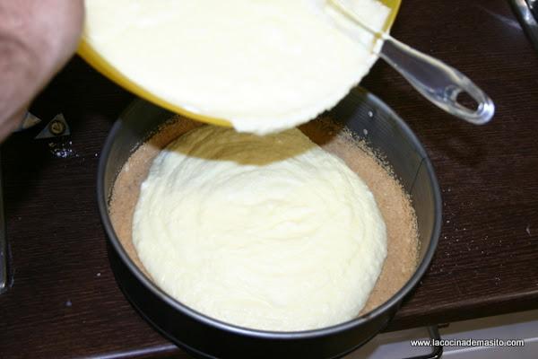 Sacamos el molde de la nevera y echamos la mezcla dentro, lo extendemos y lo dejamos enfriar en la nevera un minimo de 4 horas
