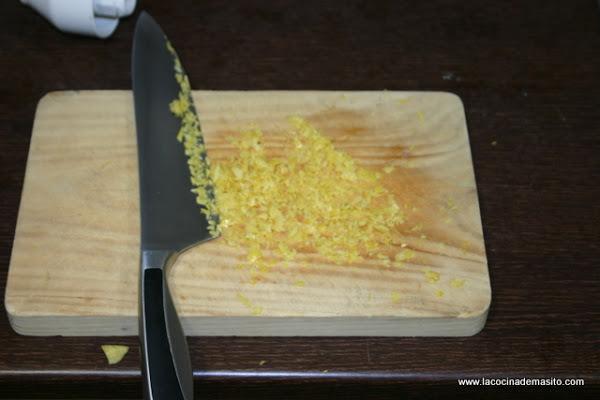 Rayamos los limones evitando la parte blanca y picamos en trozos muy finitos, reservamos