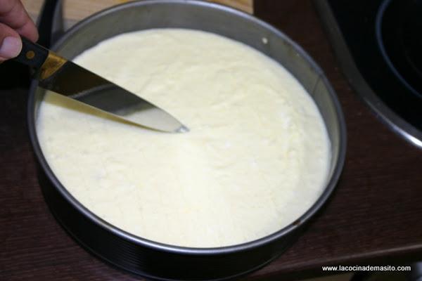 Cuando la tarta haya cuajado hacemos unas hendiduras con un cuchillo con el único propósito que es, que a la hora de verter la gelatina y esta cuaje, no se nos vaya hacia los lados.