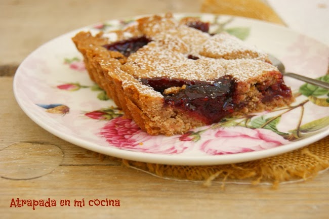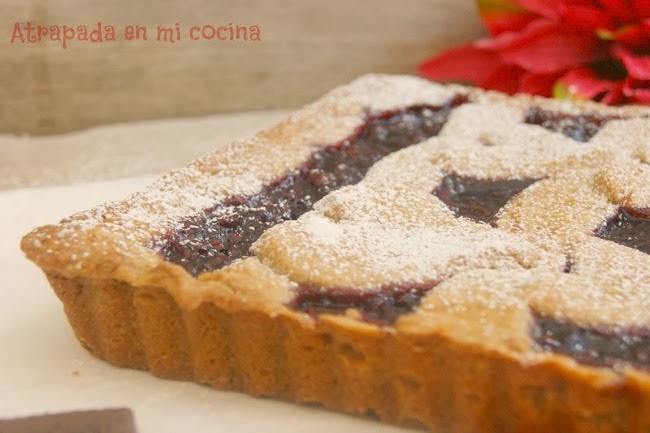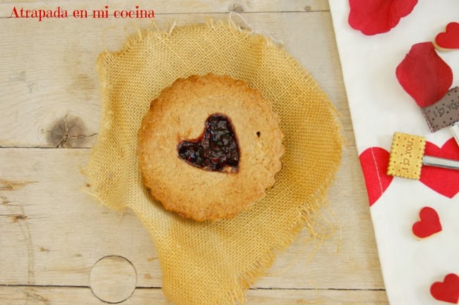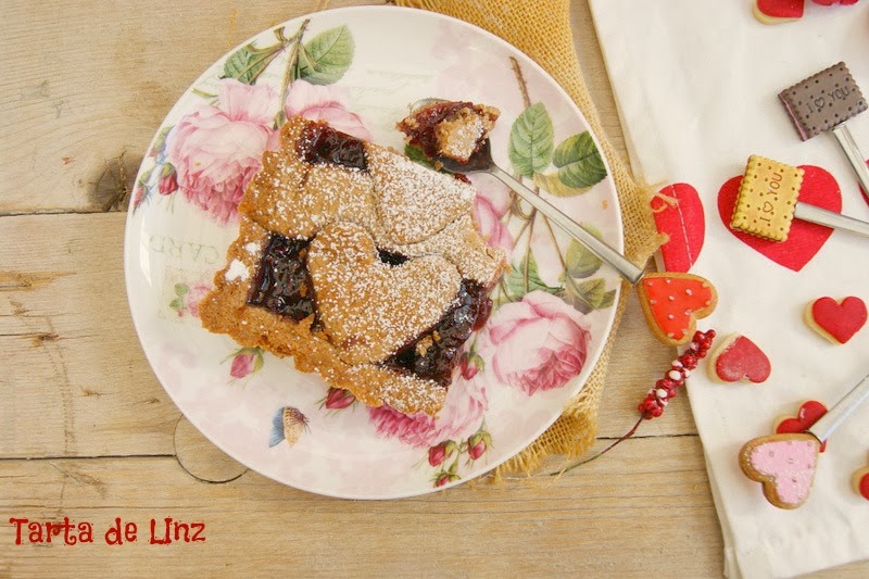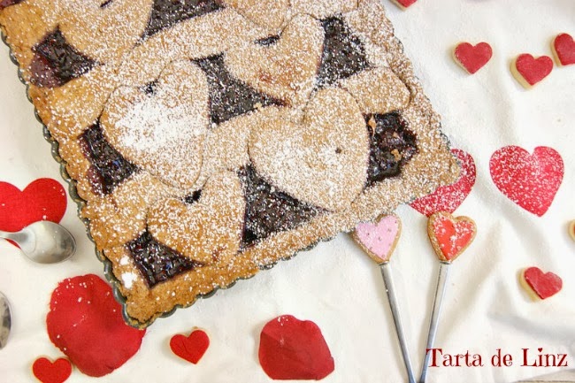 La tarta de Linz o Linzetorte emplea una masa muy crujiente hecha con harina, mantequilla sin sal, yema de huevo, ralladura de limón, canela y zumo de limón, y lleva frutos secos molidos, normalmente avellana (pero también pueden emplearse nueces o almendras), cubiertos con un relleno de mermelada de grosella o, alternativamente, de ciruela, frambuesa espesa o albaricoque. Se cubre con un enrejado hecho de masa, elaborado extendiéndola en tiras muy finas que se disponen cruzándolas sobre la confitura. La masa se pinta con clara de huevo batida ligeramente, se hornea, y a veces se decora con almendra fileteada. La tarta Linzer es un clásico en las fiestas austriacas, húngaras, suizas y alemanas, tomada a menudo en Navidad. A menudo se elabora en tamaño pequeño, de tartaleta. Este tipo de tarta reconozco que no son mi debilidad, me como un trocito y poco más, me resultan muy pesadas, aunque me apetecía prepararla mucho, y he aprovechado para hacerla en San Valentín y darle un toque acorde con el día. Mi receta cambia ligeramente de la que os he puesto arriba (que es la definición que da la wikipedia). Espero que os guste.