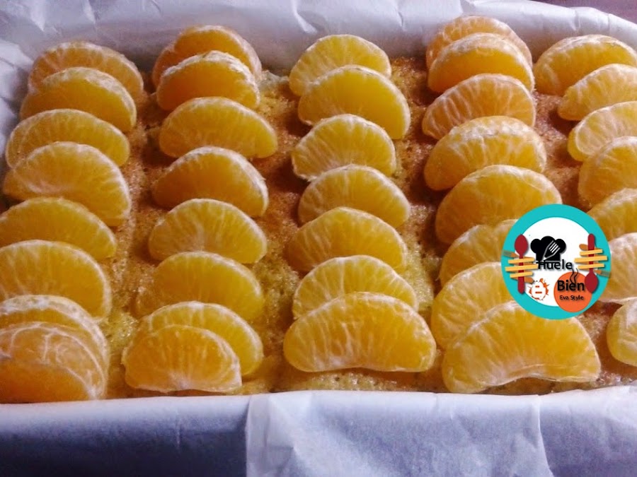 3.- Engrasamos un molde rectangular y lo forramos con papel de horno. Precalentamos el horno a 180ºC. Vertemos la masa en el molde, disponemos los gajos sobre la masa, ligeramente acaballados, y cocer la tarta durante 30 minutos.