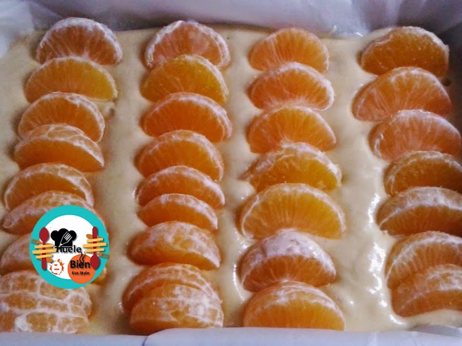 Cuando la masa crece, cubre la primera capa de mandarinas que hemos puesto.