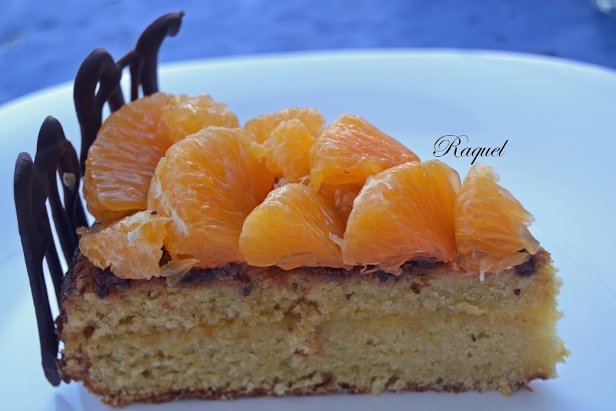 Claro que la receta que hice es mía y por dentro le he puesto un almíbar y una mermelada de mandarinas que hice unas horas antes, aunque la idea de adornar la tarta es muy parecida a la de Sergio.