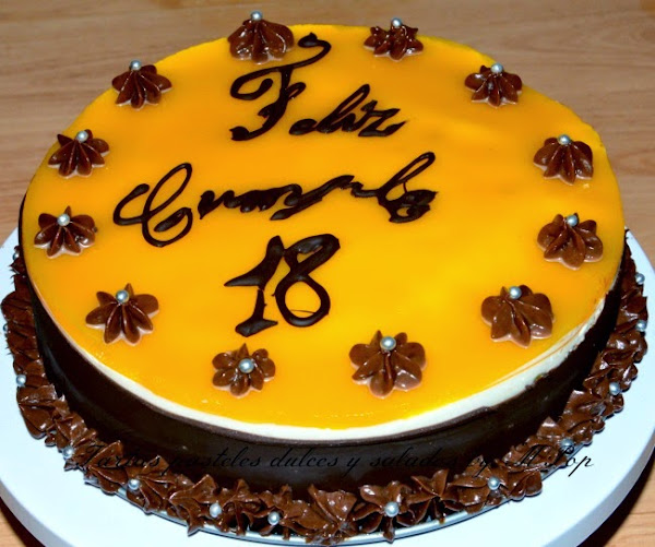 Mi hijo mayor ha cumplido sus 18 años y quería hacerle una tarta especial, algo que pueda recordar durante toda su vida; le he preguntado que tarta quería y como le gusta mucho las frutas, me dijo : " Quiero una tarta de mango" me dejó boquiabierta, porque la verdad es que tartas de mango .... buffff no conocía ninguna, ni cremas ni nada de nada, menos mal que tuve bastante tiempo y pude buscar un poco por la red.