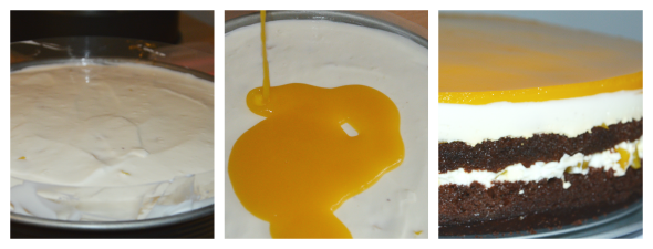 Vertemos la gelatina de mango con cuidado sobre la mousse, inclinando el molde para que la gelatina llegue a todos los lados.