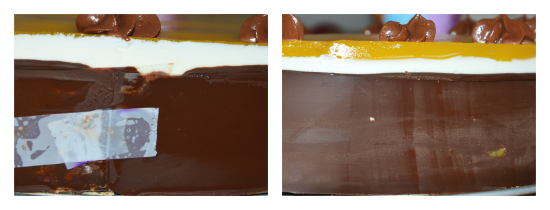 Yo tuve que colocar una tira de papel de acetato porque la mousse me llegaba casi al borde superior, si la tenéis es mejor que la coloquéis incluso desde el principio, antes de empezar a montar la tarta.