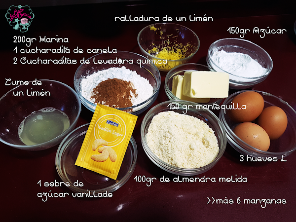 Ponemos papel en el fondo de un molde, los laterales los engrasamos, vertemos la masa y colocamos las manzanas arriba. Ponemos un poco de azúcar sobre cada trozo de manzana. Horneamos durante unos 30 minutos hasta que esté bien dorada.