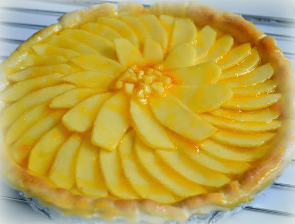 3. Vertemos la crema pastelera sobre la masa, y cortamos dos manzanas en finas láminas como en la foto. Vamos decorando la superficie.