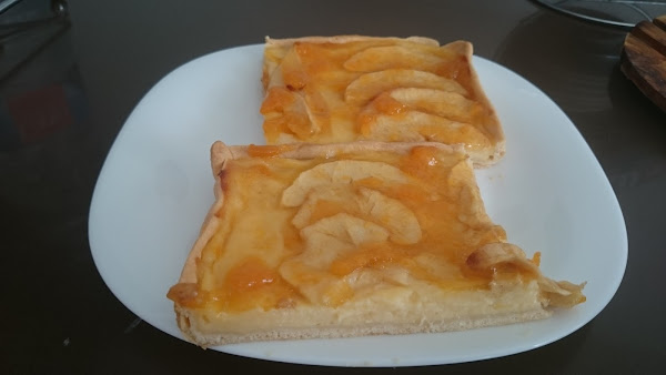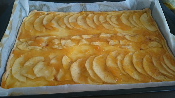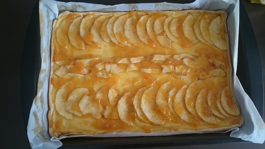 Ahora cogemos la lámina de pasta quebrada y la trabajamos un poquito con la ayuda de un rodillo, cogemos un molde y colocamos papel de horno, sobre este extendemos la masa y le hacemos un reborde sobre las cuatro paredes de un centímetro más o menos de altura, y procedemos a verter la crema pastelera con la ayuda de una espátula vamos repartiéndola por toda la base y que llene hasta la altura que hemos hecho el reborde, ahora cogemos la manzana que teníamos reservada y colocamos sobre la crema pastelera en dos tiras y espolvoreamos con azúcar por encima de la manzana y procedemos a meter en el horno que previamente habremos precalentado a 170 º durante 45 min. aproximadamente iremos vigilándolo para que no se nos queme, cuando esté ya retiraremos del horno y dejaremos enfriar, cuando ya esté fría procederemos a pincelar con la mermelada por toda la tarta y ponemos en el frigorífico y ya tenemos nuestra fantástica y riquísima tarta de manzana casera, espero que os guste.