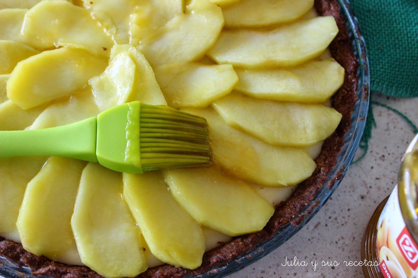Las ponemos encima de la crema pastelera en forma de abanico o como mas os guste. Derretimos la mermelada de albaricoques en el microondas y pincelamos las manzanas con ella.