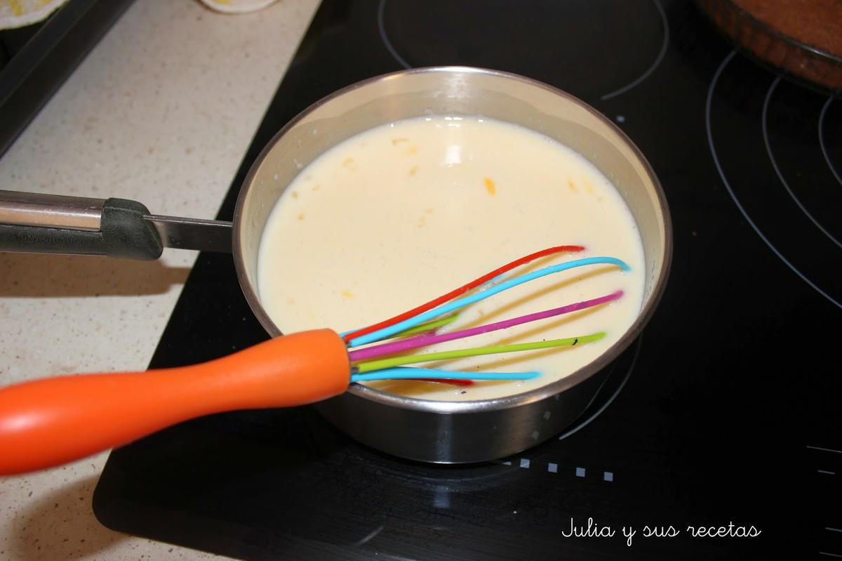 Comenzamos haciendo la crema pastelera, pues tiene que enfriarse. Podéis ver como se hace aqui con el paso a paso. Solo tenéis que añadirle la esencia de vainilla a la leche.