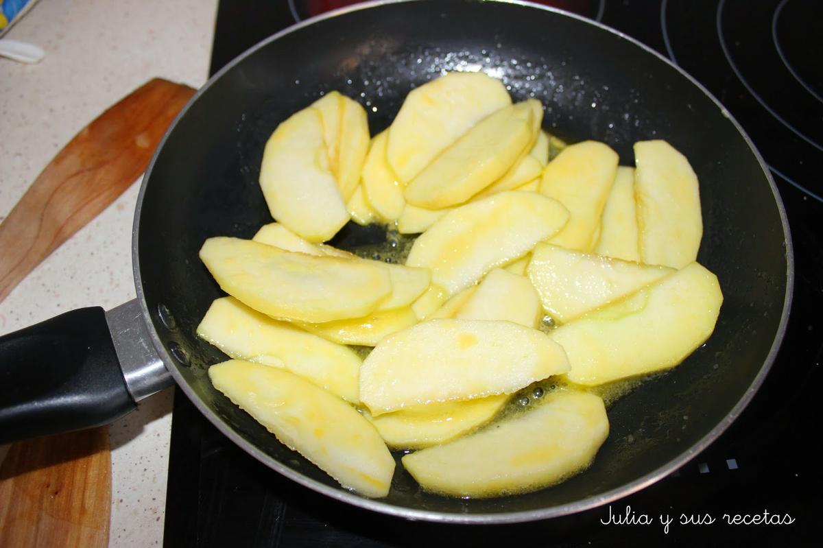 Pelamos las manzanas, le quitamos el centro y las partimos en lonchas. En una cazuela ponemos las mantequilla y el azúcar y cuando esté derretida añadimos las manzanas y las salteamos un poco. No demasiado, que queden enteras para que no se partan.