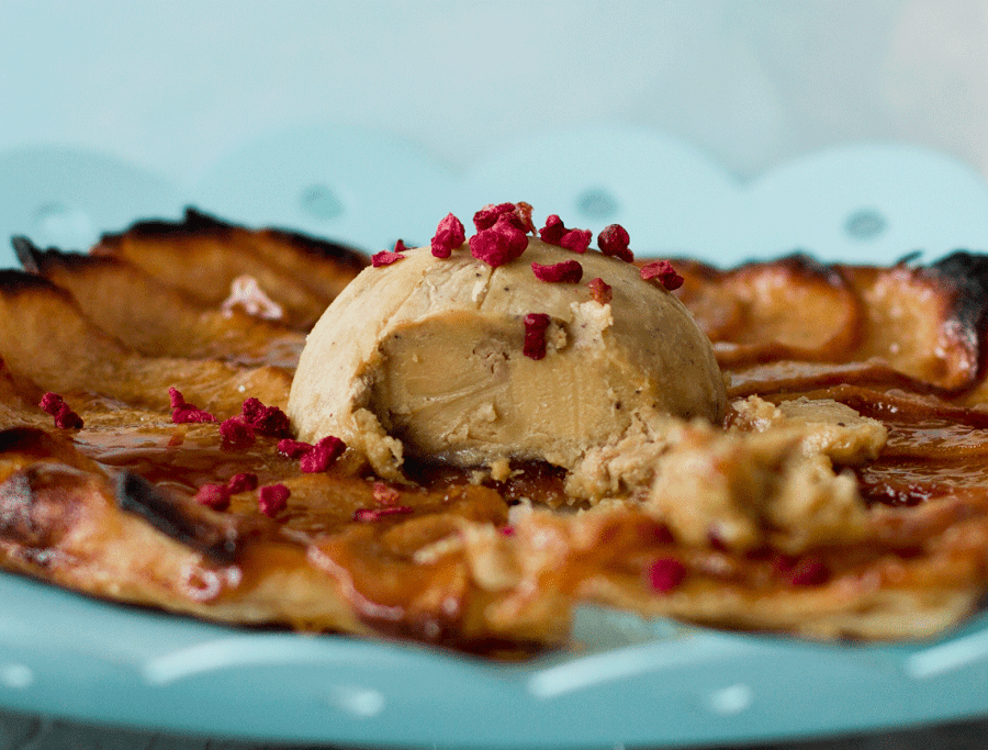Dejar enfriar un poquito la tarta. Colocar una bomba de foie mi cuit en el centro y adornar con frambuesa liofilizada.