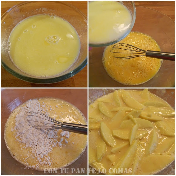 4. Pelamos las manzanas y las cortamos en gajos finitos. La mitad se las añadimos a la mezcla anterior.