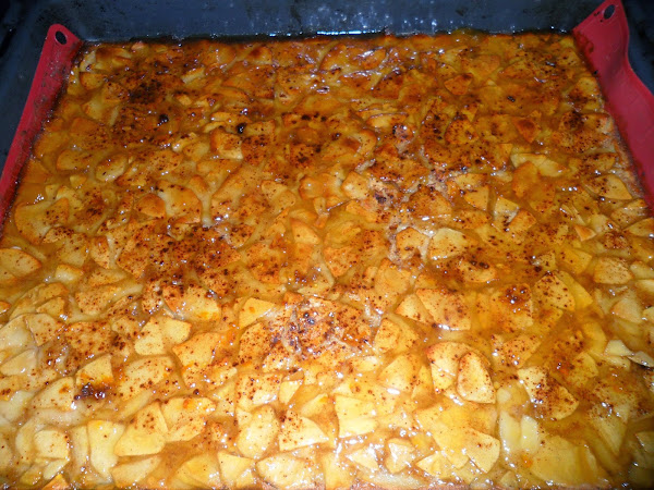Protegido con silicona o papel de horno para que no se pegue.Espolvoreamos con canela molida y unos trocitos de mantequilla por toda la superficie.