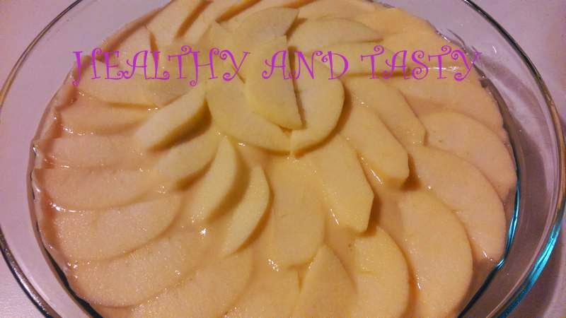 Ponemos todos los ingredientes en un bol y lo batimos todo con la batidora. Untamos el molde con un poco cde aceite de girasol y vertemos la mezcla. Decoramos con otra manzana cortada en láminas.