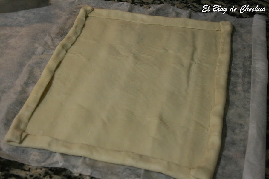 Extendemos nuestra hoja de hojaldre, y doblamos los extremos que cerramos humedeciendo un poquito, quedando como en la foto: