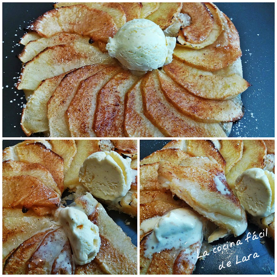 ¿No os encanta la tarta de manzana?A mi me vuelve loca y esta versión rápida ni os cuento.Y no es porque sea rápida pero es que entre el crujiente del hojaldre,la manzana templada y el contraste frío del helado es para volverse loquitos por esta tartita.