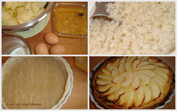 Batir los huevos. Añadir el líquido de la maceración, la leche, y la maicena. Remover para diluir la harina. Introducir la almendra triturada y la compota de manzana. Rellenar la tarta con la mezcla.