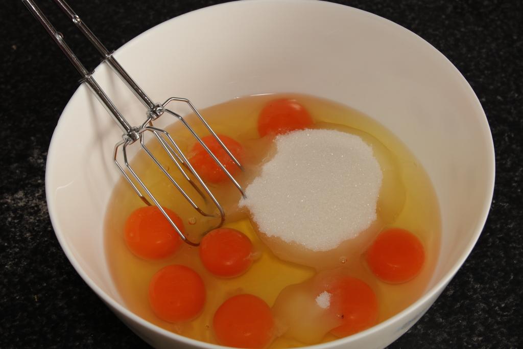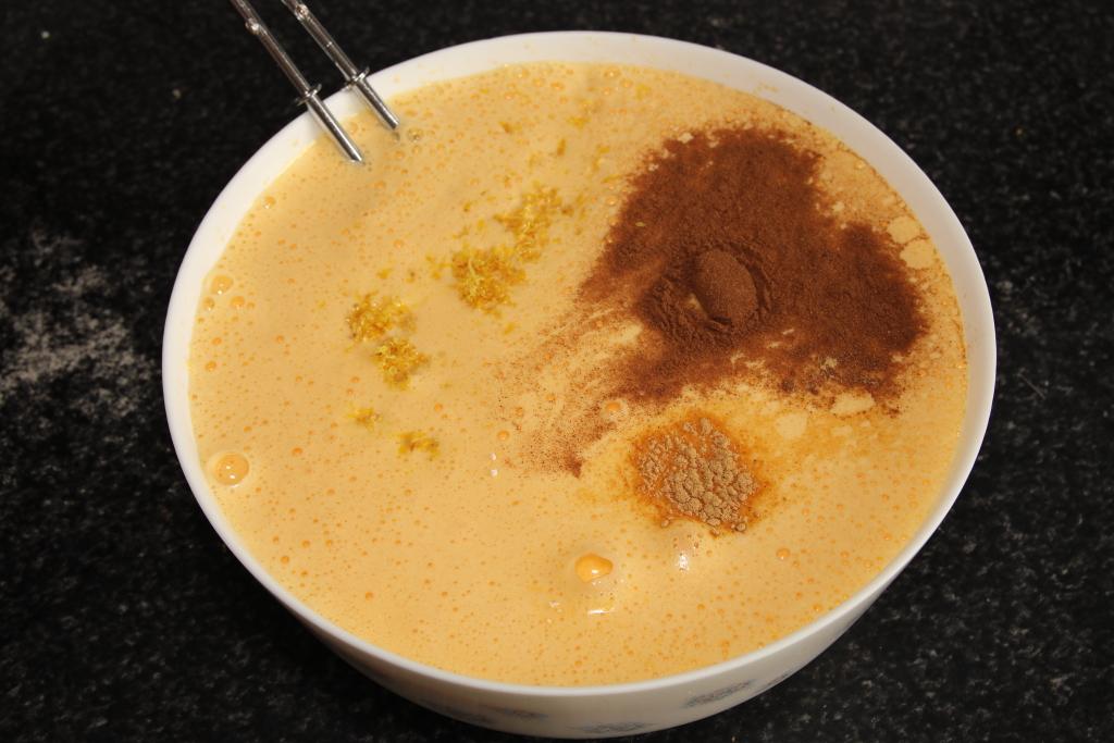 En un bol grande echamos los huevos y el azúcar, batimos con las varillas eléctricas hasta que blanqueen y doblen su volumen. Añadimos los yogures, la harina, la ralladura de limón, la canela, el resto de especies (en éste caso 1 pizca de jengibre) y seguimos batiendo hasta que se integren.