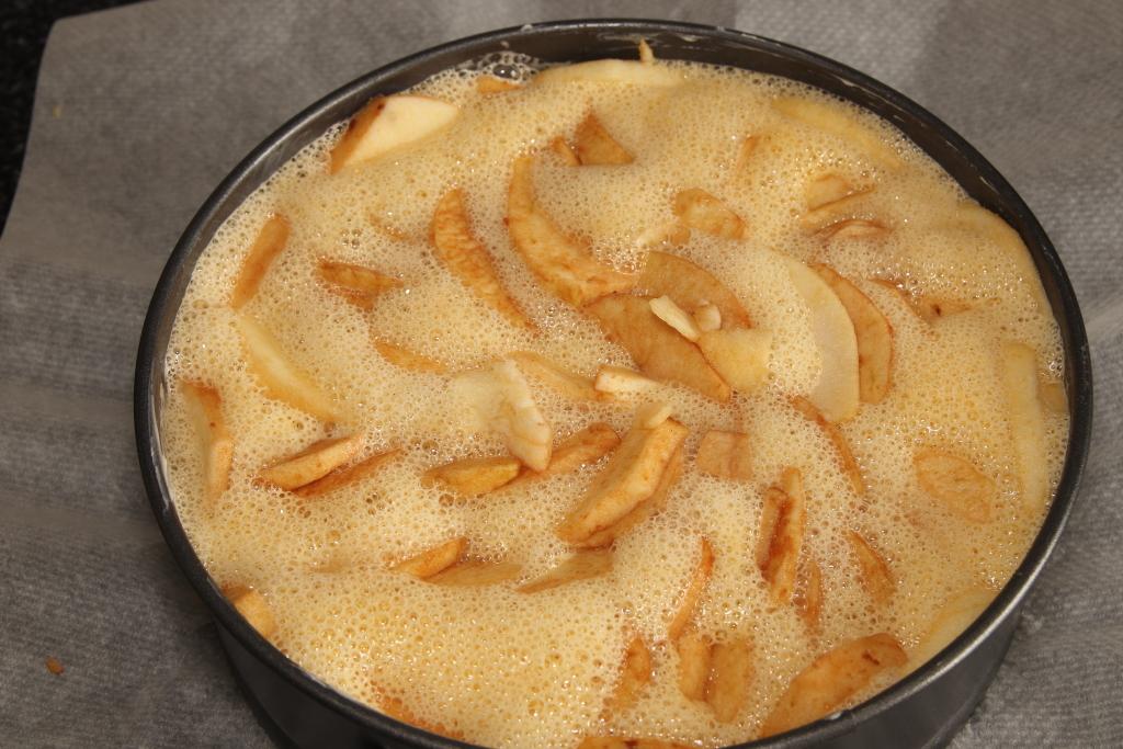Pelamos, descorazonamos y cortamos en gajos finos las mananas. Las diponemos sobre la mezcla del molde y horneamos a 180ºC, calor arriba y abajo durante unos 60 minutos o hasta que al pincharla con un palito salga limpio. Colocamos sobre la rejilla forrada con papel de horno para evitar los incómodos goteos. Si vemos que a mitad de cocción se tuesta demasiado la manzana, tapamos con papel de aluminio y seguimos horneando.