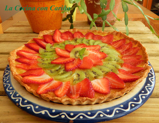 Ya lo tenemos todo. En un molde enmantecado, colocamos la masa quebrada, que a mi me gusta meter unos 5 minutos en el horno a 180ºC por arriba y por abajo antes de rellenar, pinchándola con un tenedor y poniéndole unos garbanzos que tengo para este menester. De esta manera evitamos que leve. Rellenamos la tartaleta y metemos durante 50 minutos o hasta que esté cuajada la masa. Dejamos enfriar y decoramos con la fruta por encima. Ahora aplicamos con un pincel la jalea que hemos preparado y dejamos reposar en fresco hasta comer