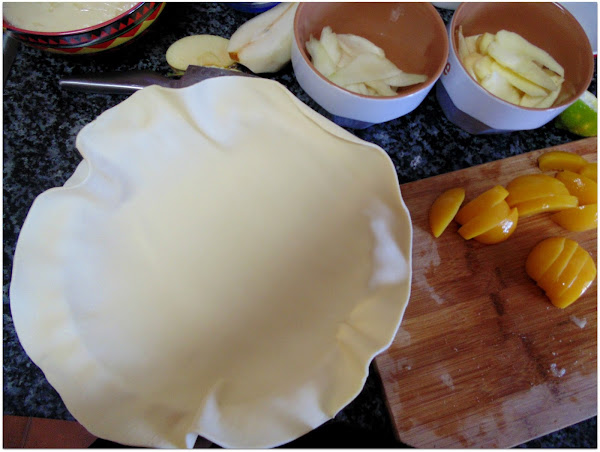 Engrasamos nuestro molde con un poco de aceite vegetal o mantequilla y montamos la masa de hojaldre. Con un tenedor pinchamos en la base y en los laterales. Sólo un poco, no hace falta taladrar la masa! Pelamos las manzanas, el quitamos el corazón y cortamos por la mitad. Troceamos en rodajas. Los melocotones sencillamente los cortamos en rodajas también.