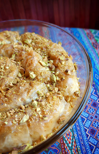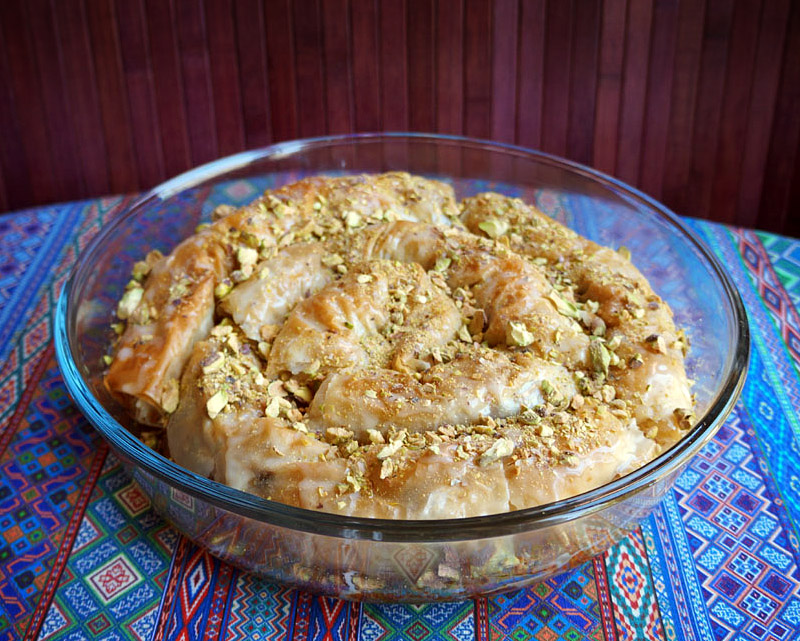 Ya sólo queda bañarla de leche condensada (echarlo en forma de hilo) y añadir unos pistachos picados.