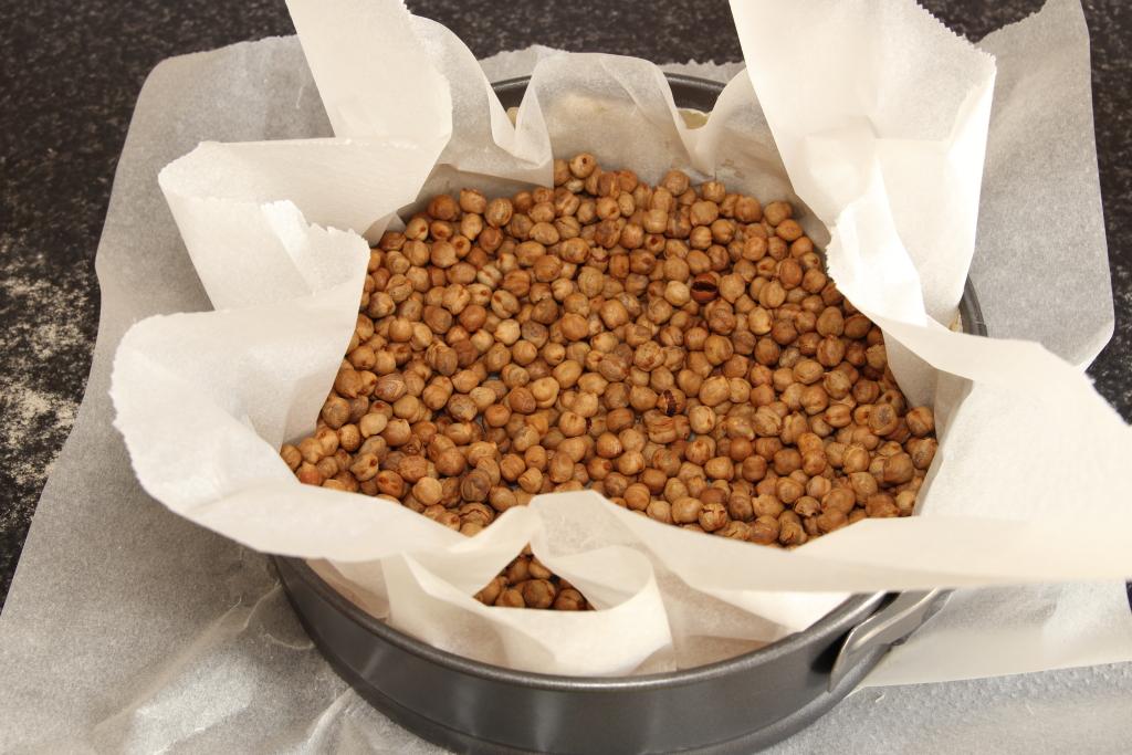 Repartimos bien la pasta quebrada por el molde (o la lámina de hojaldre, que pincharemos con un tenedor), procurando dejarla todo del mismo grosor, cubrimos con papel de hornear, echamos peso (unos garbanzos para estos menesteres) y llevamos al horno durante 15 aproximadamente, que se dore.